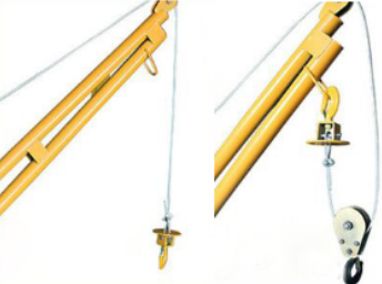 小吊機(jī)臂桿的頂端下方大多配有一條固定的吊環(huán),這個(gè)吊環(huán)的作用就是將小吊機(jī)單獨(dú)定滑輪的吊運(yùn)方式改變?yōu)槎▌?dòng)滑輪組,我們都知道,定滑輪只能改變力的方向而不能改變里的大小,而滑輪組既可以改變力的方向,又可以改變力的大小,從而變相的為小吊機(jī)增加了一倍的載重量。